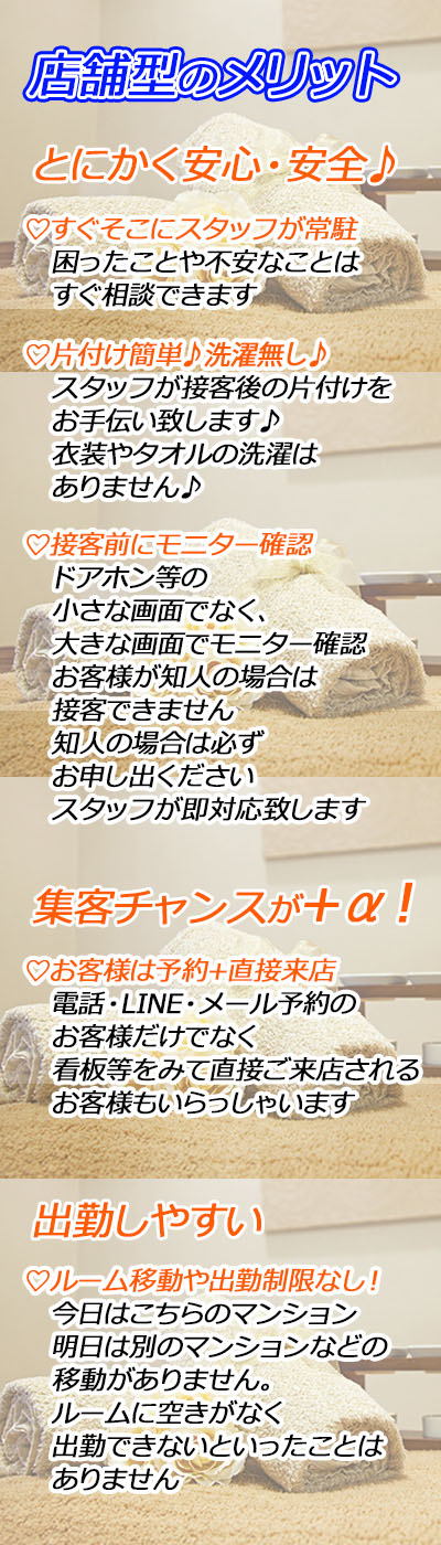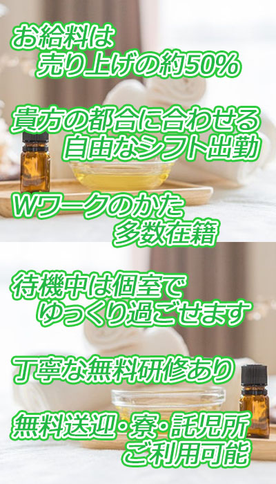 | 待遇 | ・雇用証明、勤務証明発行できます ・施術ユニホームは無料でお貸しします ・マイカーで通勤できます 【無料駐車場あります】 ・愛媛県内無料送迎致します 【新居浜、西条、今治、 四国中央、松山など】 香川県の方も地域や時間帯によっては可能です まずはお問い合せください。 ・他のお仕事と掛け持ちOKです ・接客前のモニター確認ができますので 知り合いの方などNGできます ・待機は個室での待機となります ・wifi完備 ・すぐに入居できるマンション等もあります ・託児所有 ・出張面接いたします ・カウンセラー在籍(悩み相談を受けることができます) 当店はインボイス制度登録店ですので女の子がインボイス制度に登録する必要はありません。 女の子に負担がかからないように調整できる体制を整えております! ※条件は何でもご相談ください |